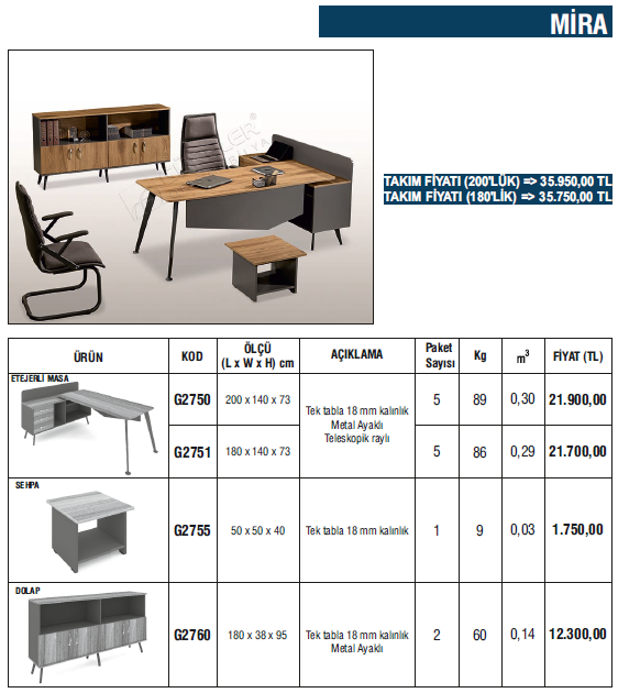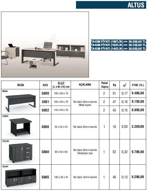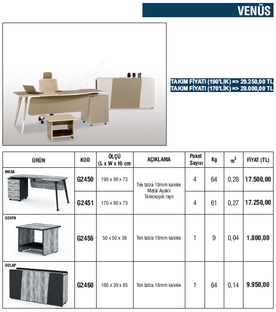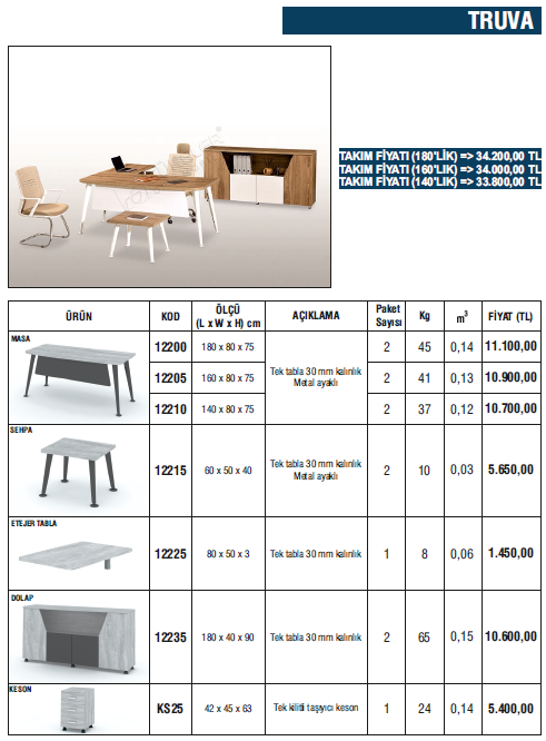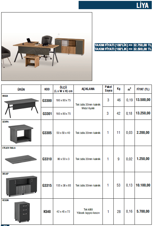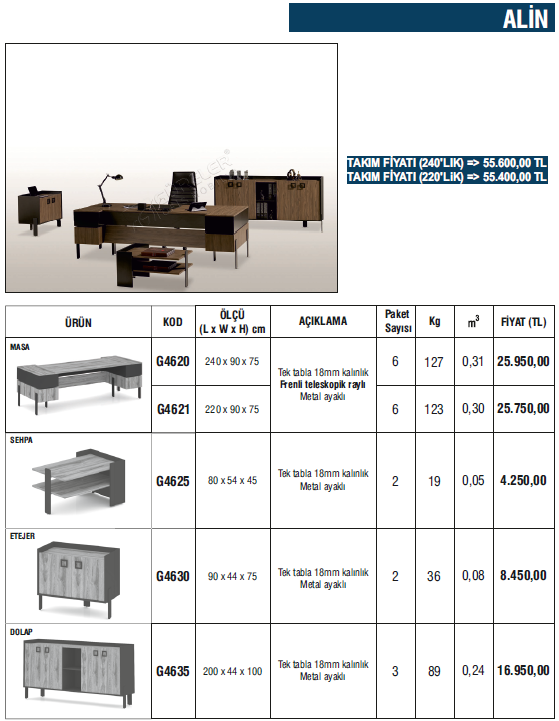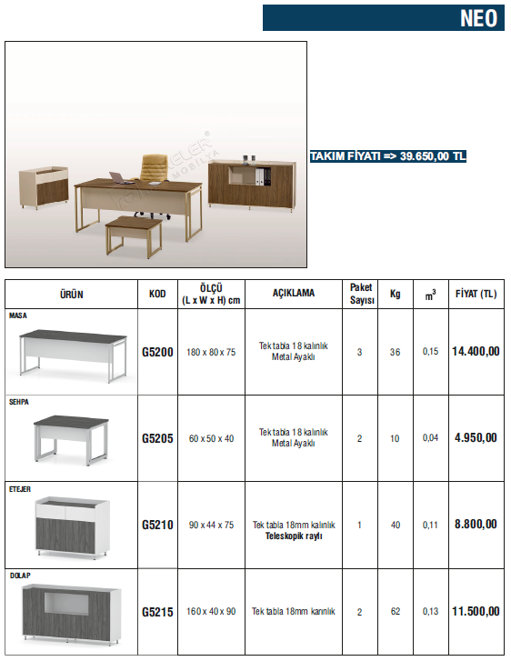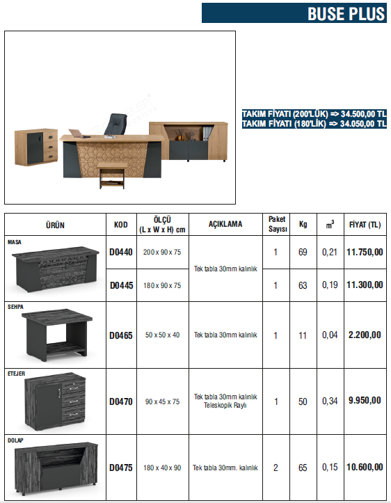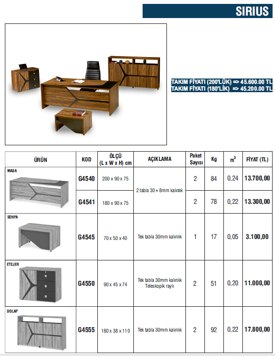 MASA -- 250x120x75 h SEHPA -- 100x60x45 h ETEJER -- 90x50x75 h DOLAP - 225x40x116 h